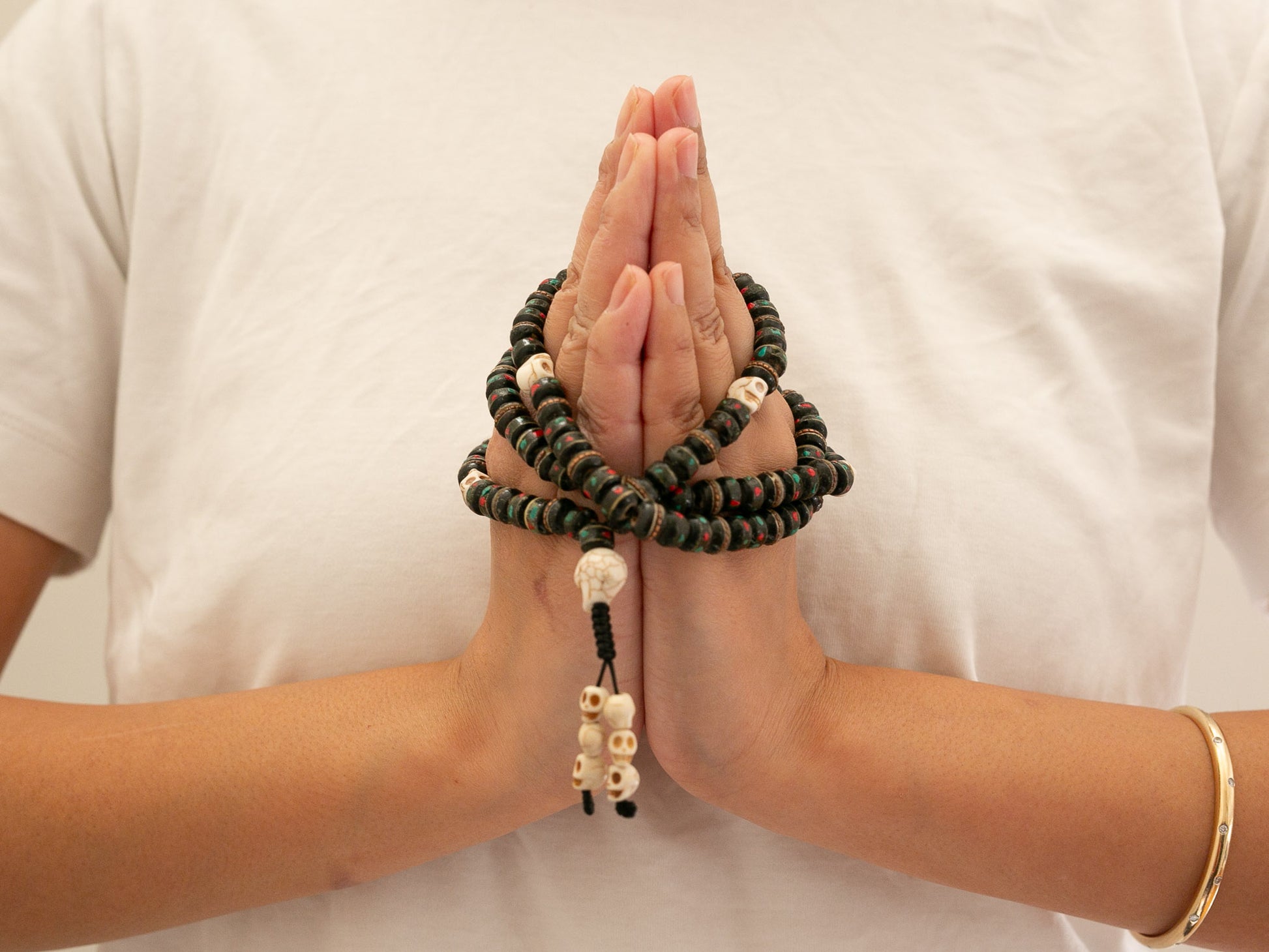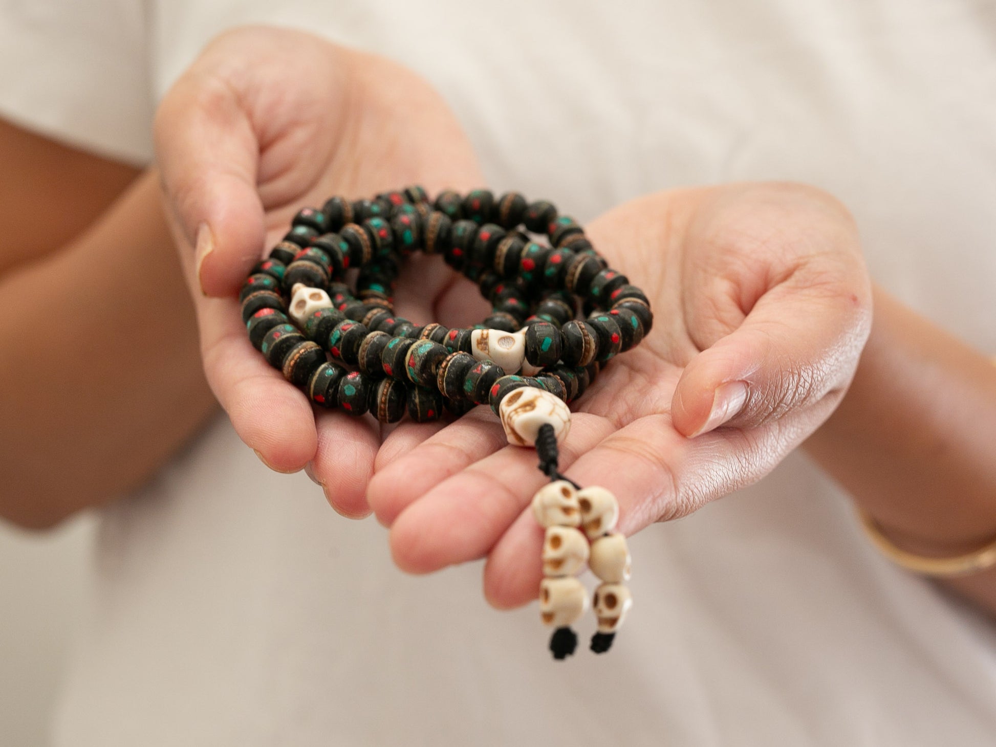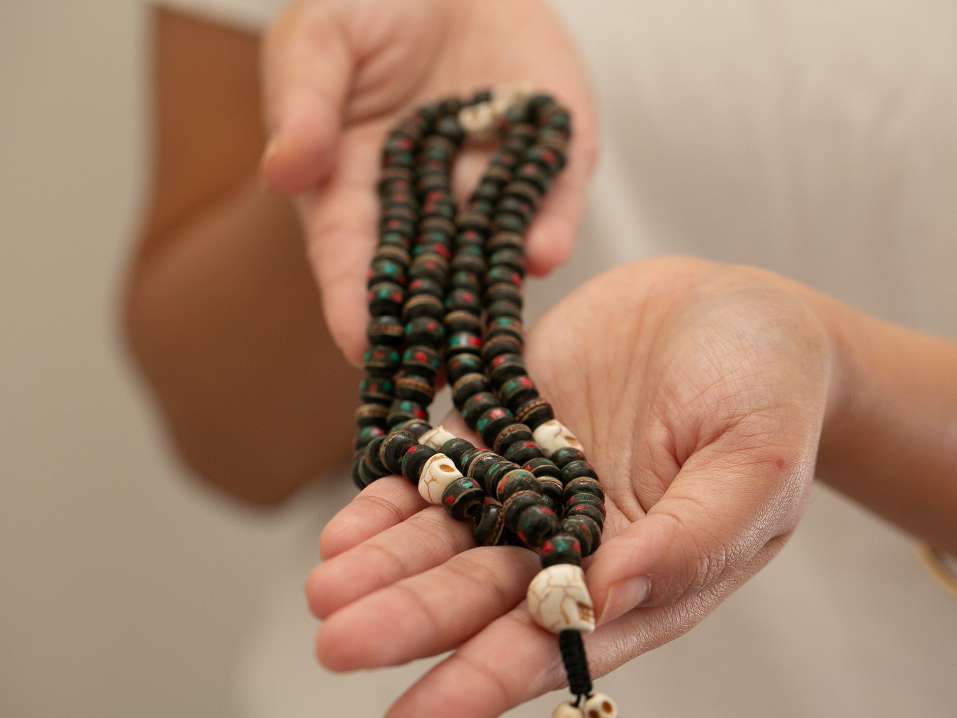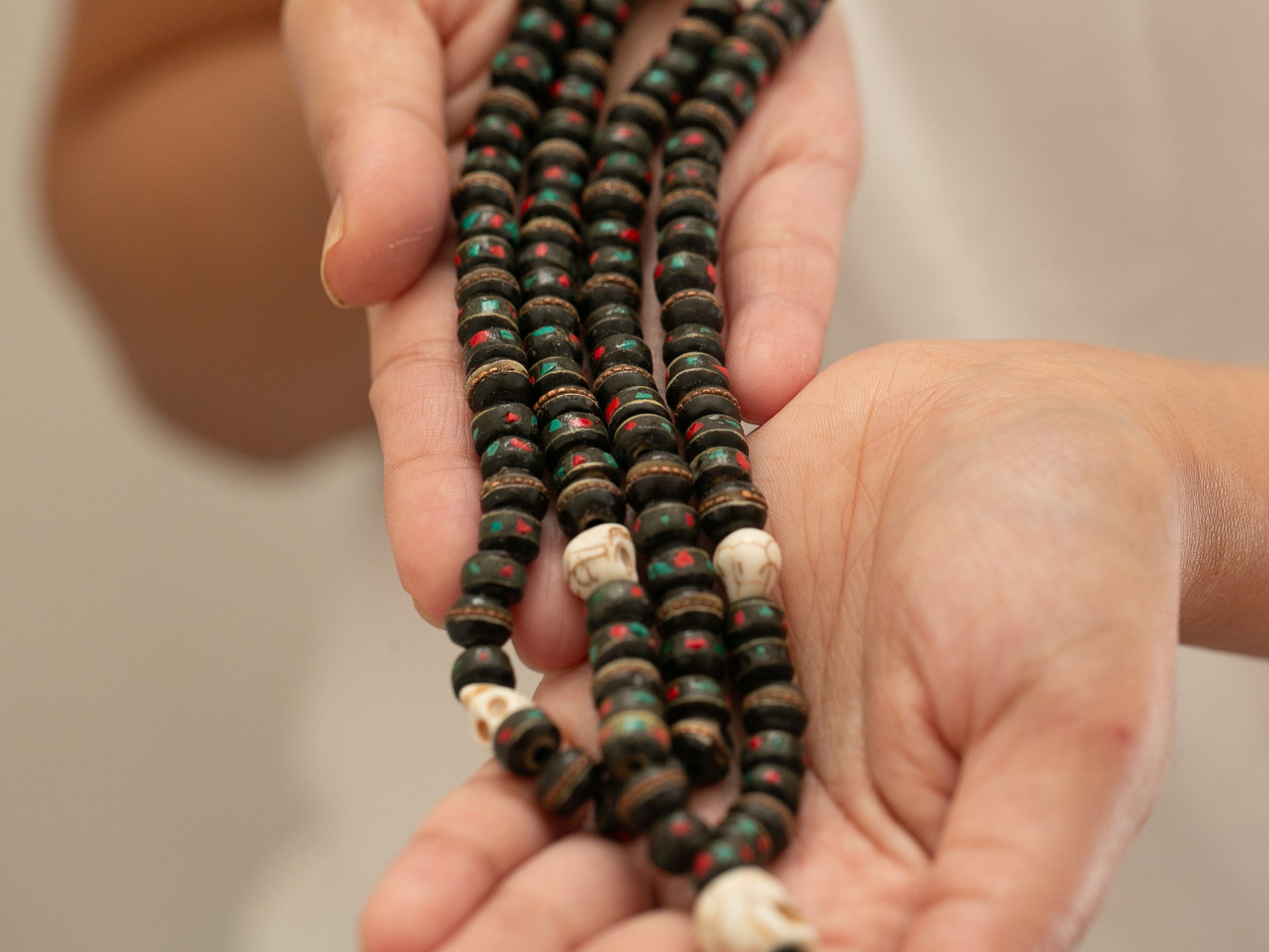This mala is made from animal bone and has turns of metal wire with coral and turquoise inlays. These two gemstones are widely used in Tibetan jewellery as it is believed to offer the strongest protection from negative energies and obstructions in one's spiritual journey. Animal bone is popularly used in malas to remind the owner about impermanence and the limited time that we have. From a practical point of view, it was a material that was plentiful in historical Tibet. Bone malas are also associated with powerful and wrathful protector deity practices in Mahayana Buddhism.