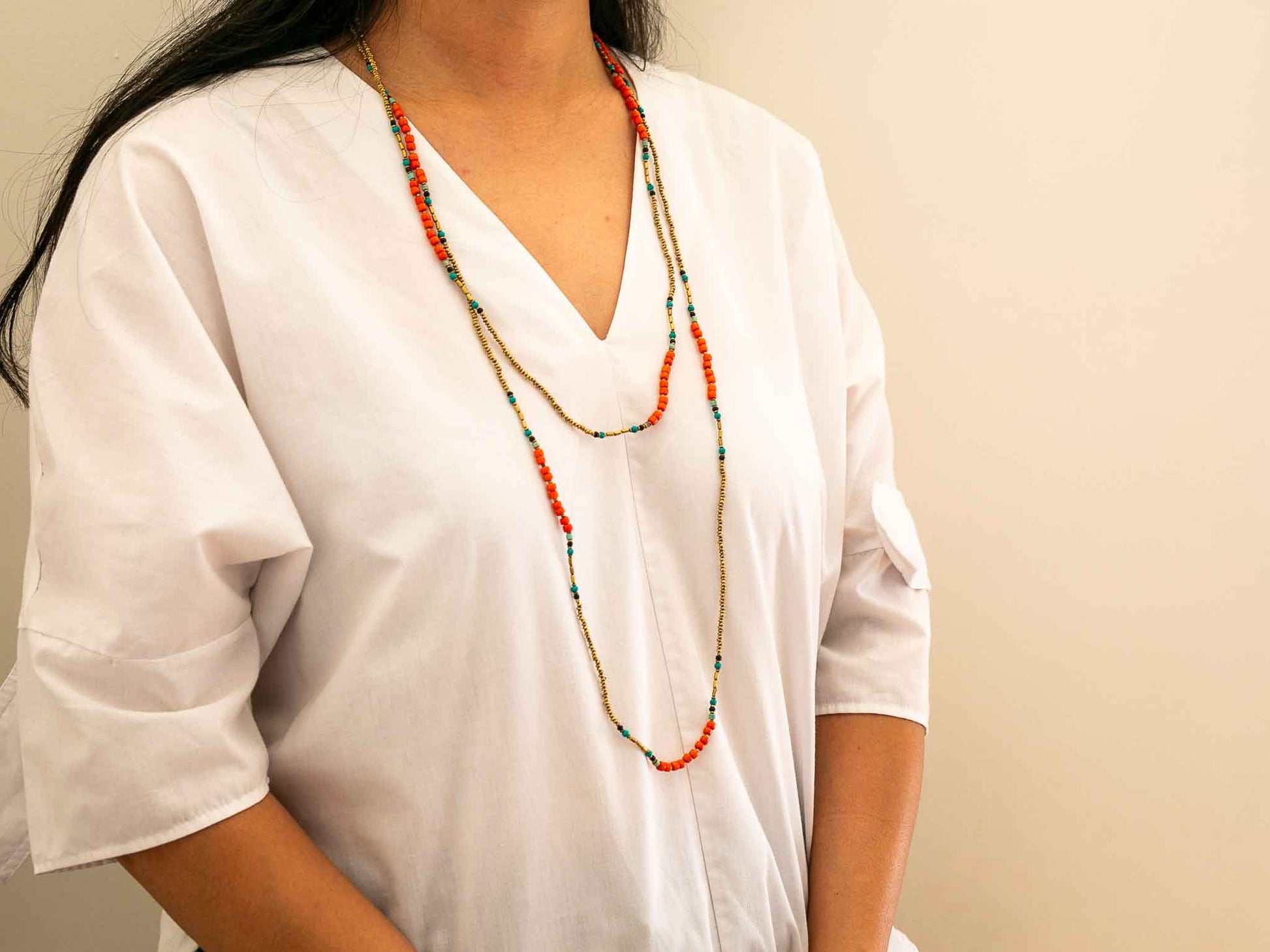 This extra long necklace has been carefully assembled by skilled artisans in Nepal and has bohemian charm. It features coral, brass, turquoise and other colourful beads. It is very versatile and can be worn around the neck in several ways or even wrapped several times around the wrist.