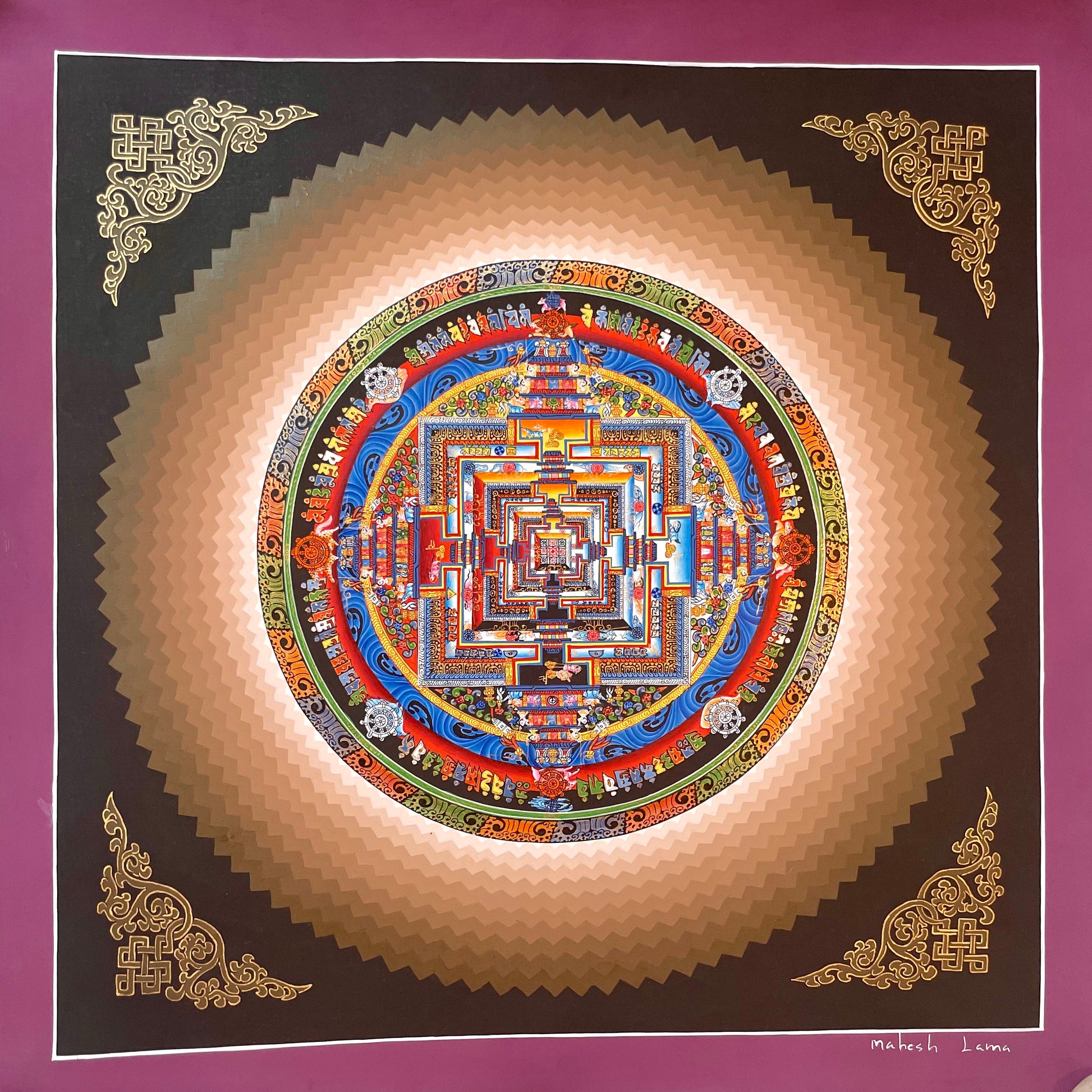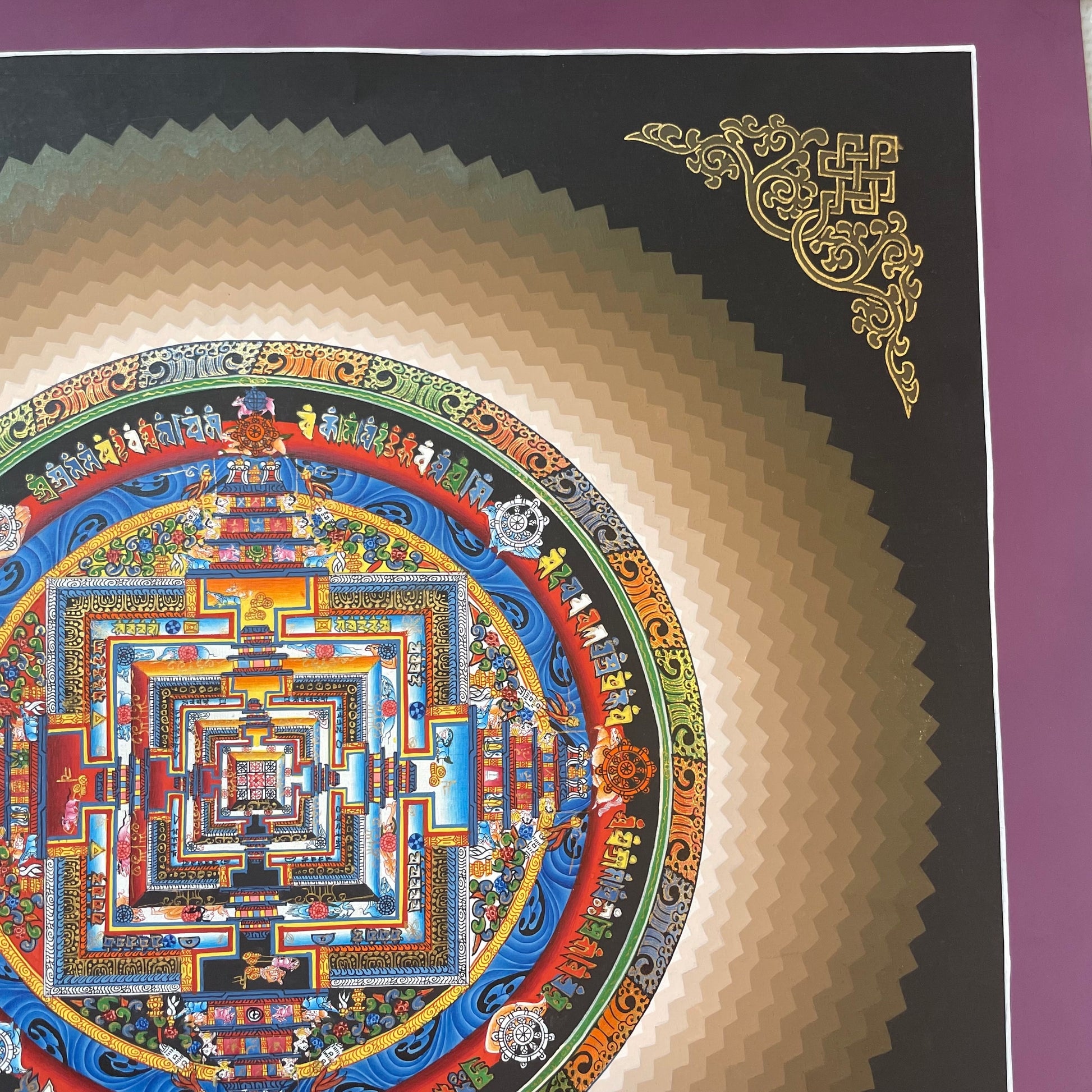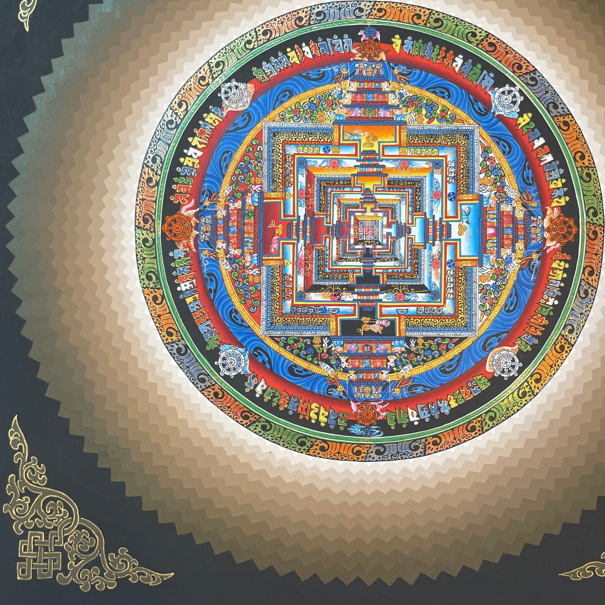 This original mandala has been hand painted by skilled Nepalese thanka painters and draws focus inwards towards the central motif of the Kalachakra Mandala.