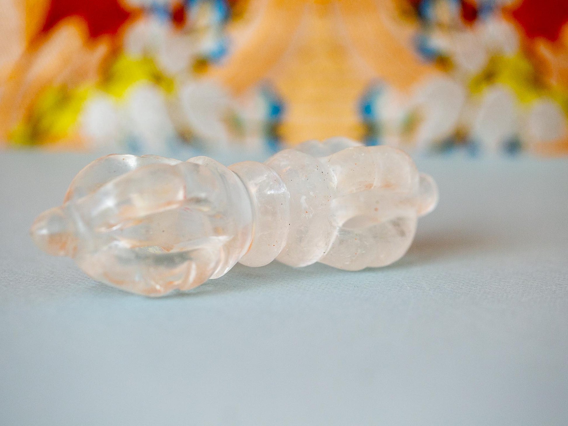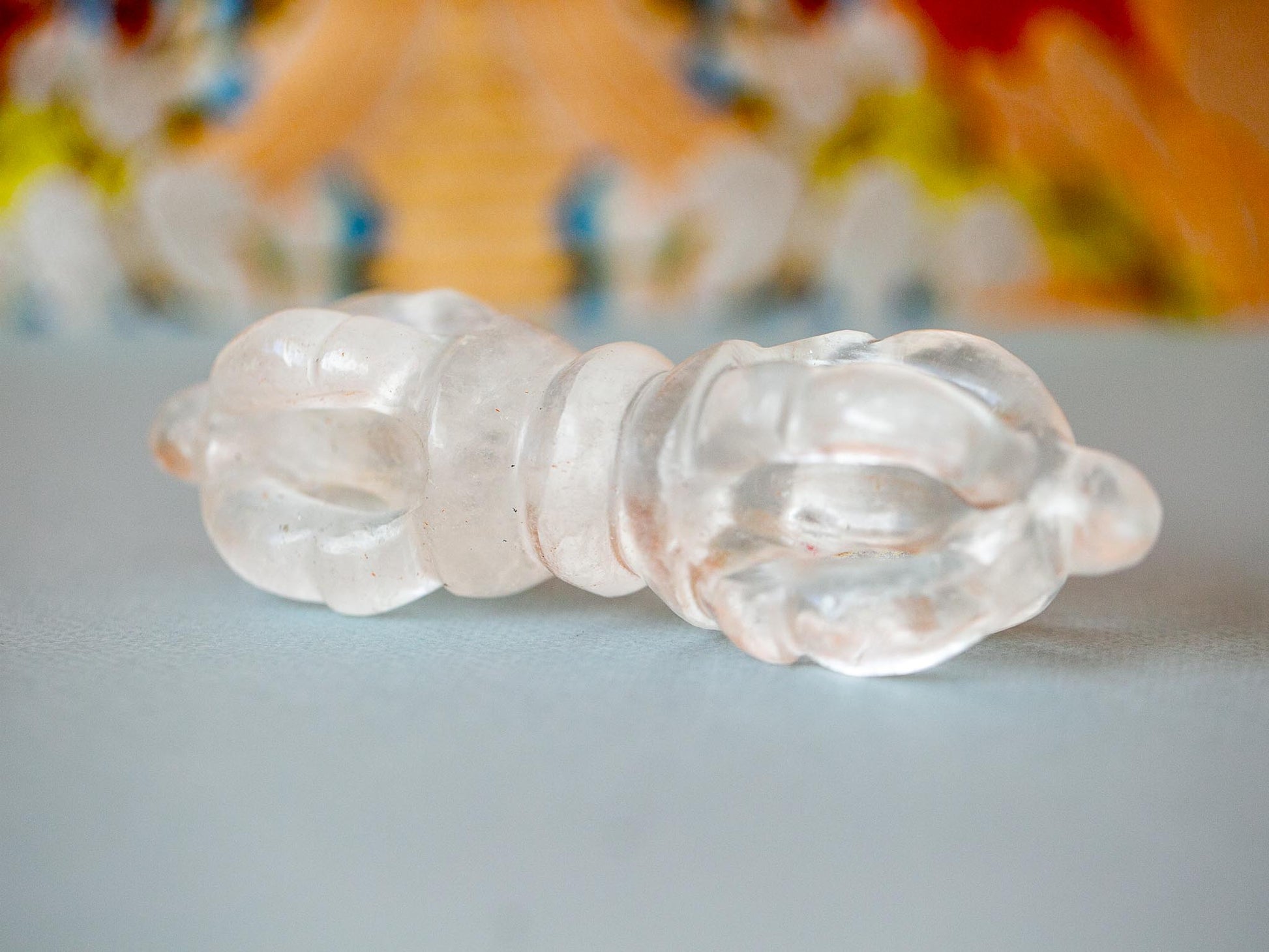This beautiful artefact has been carved out of Nepalese quartz crystal. It is cool and solid to touch and has been weighted/balanced to use during meditation and rituals. The finishing is smooth and luminous, and a powerful crystal cut to a Vajra made perfect sense to us.
