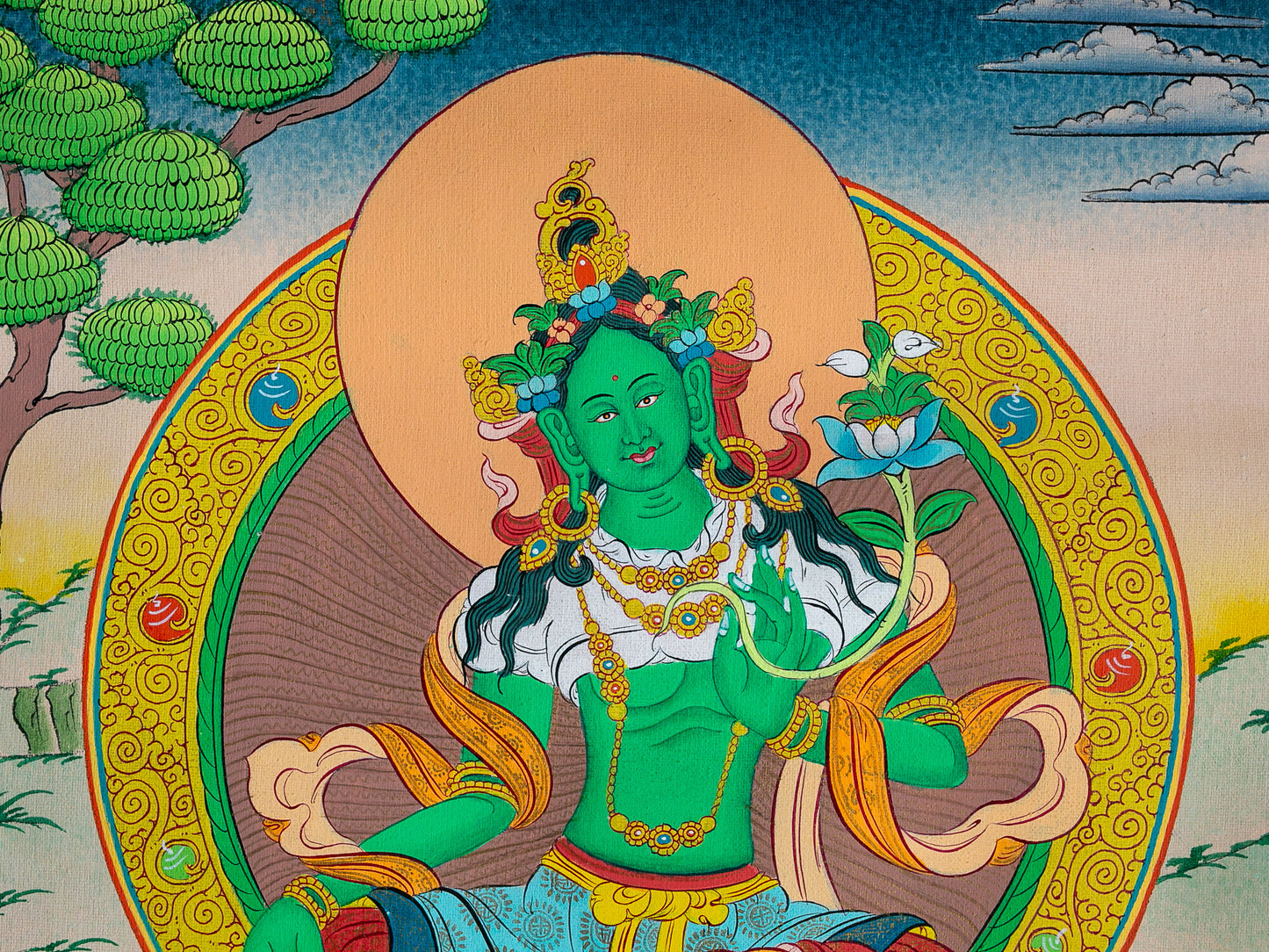 Tara, the "mother of liberation," is a revered Buddhist deity embodying compassion, wisdom, and enlightened action. She is believed to swiftly answer the prayers of those in need, offering protection, solace, and guidance on the path to spiritual liberation. Her profound compassion is likened to a mother's love, extending to all beings as she works tirelessly to relieve suffering. Green Tara has her right leg extended outwards, symbolising her willingness to spring into action and help all sentient beings immediately.