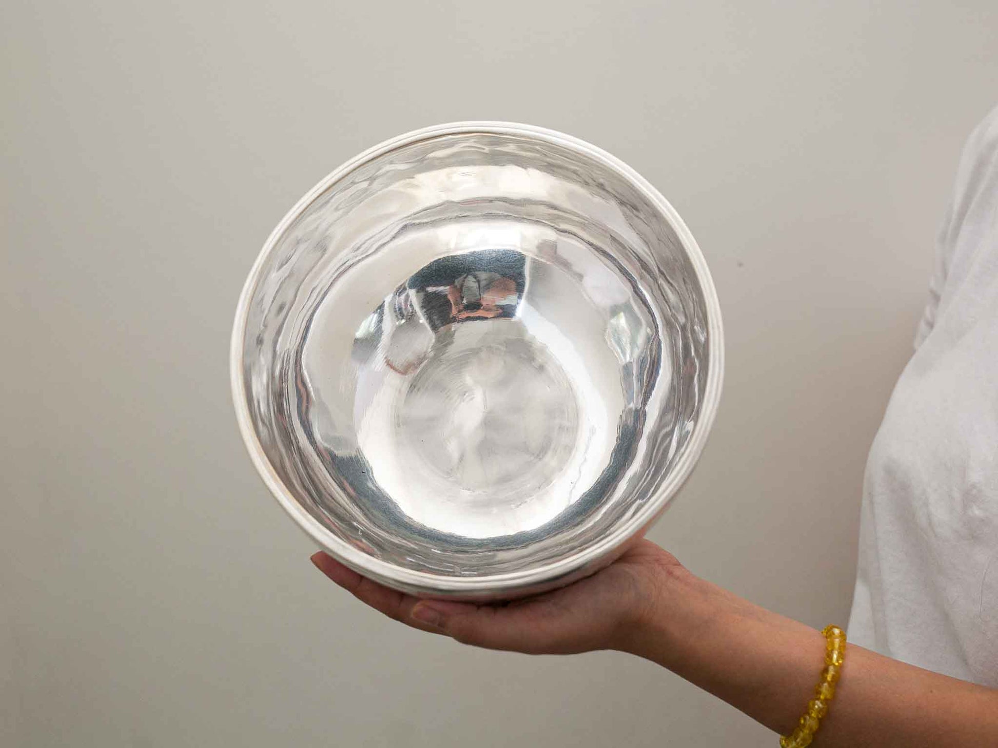 Our Silver Moon Singing Bowls are hand-hammered masterpieces, crafted with intention and care, using traditional techniques. Each bowl begins as a plate of high-quality metal alloy, shaped and refined through hundreds of hammer strikes to achieve its final form and tone. The final silver plating not only adds to its beauty but also enhances the clarity and depth of sound.