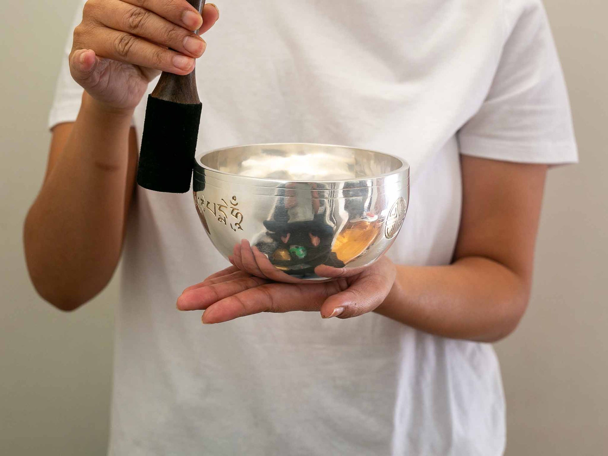Our Silver Moon Singing Bowls are hand-hammered masterpieces, crafted with intention and care, using traditional techniques. Each bowl begins as a plate of high-quality metal alloy, shaped and refined through hundreds of hammer strikes to achieve its final form and tone. The final silver plating not only adds to its beauty but also enhances the clarity and depth of sound.
