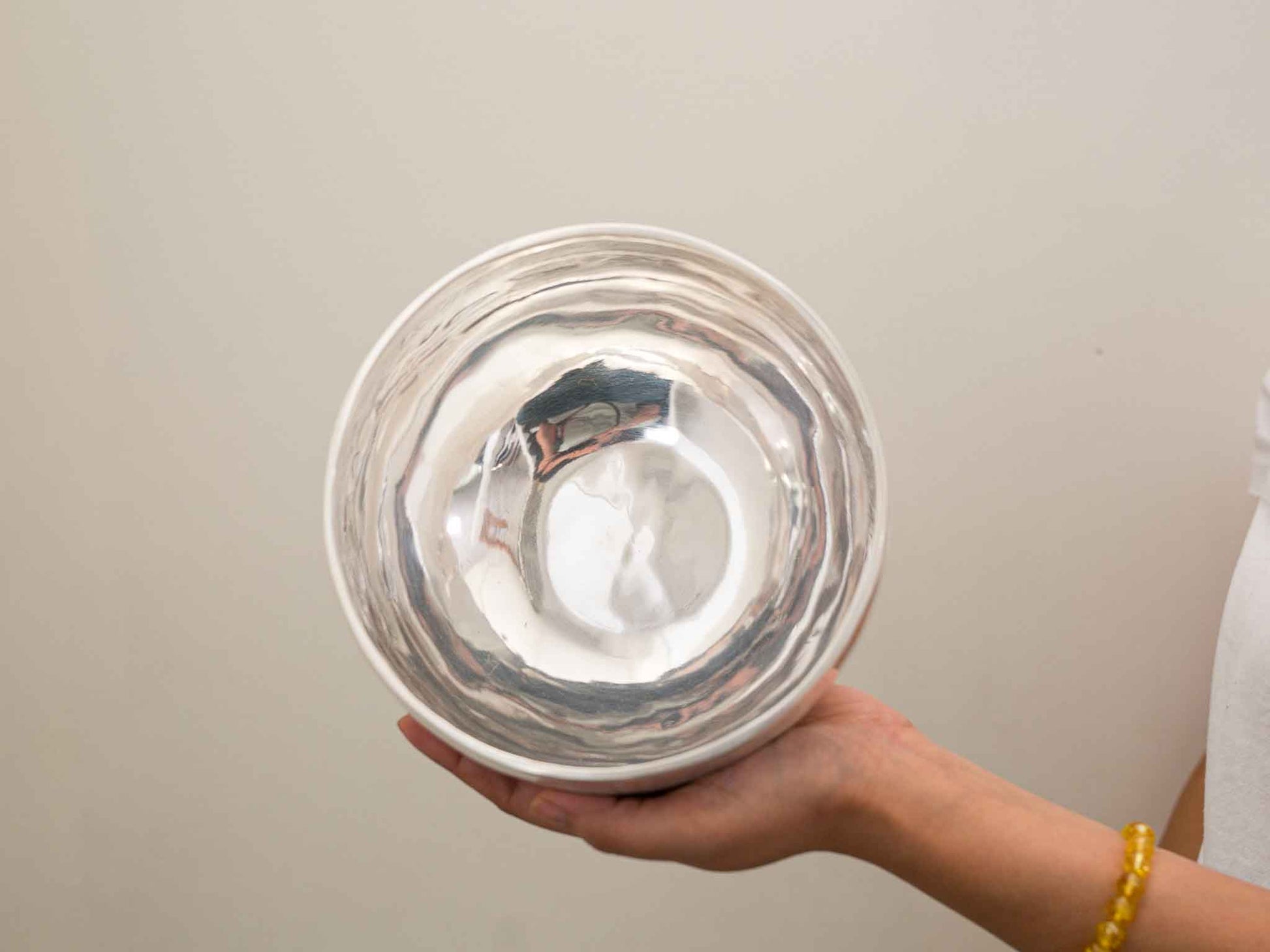 Our Silver Moon Singing Bowls are hand-hammered masterpieces, crafted with intention and care, using traditional techniques. Each bowl begins as a plate of high-quality metal alloy, shaped and refined through hundreds of hammer strikes to achieve its final form and tone. The final silver plating not only adds to its beauty but also enhances the clarity and depth of sound.