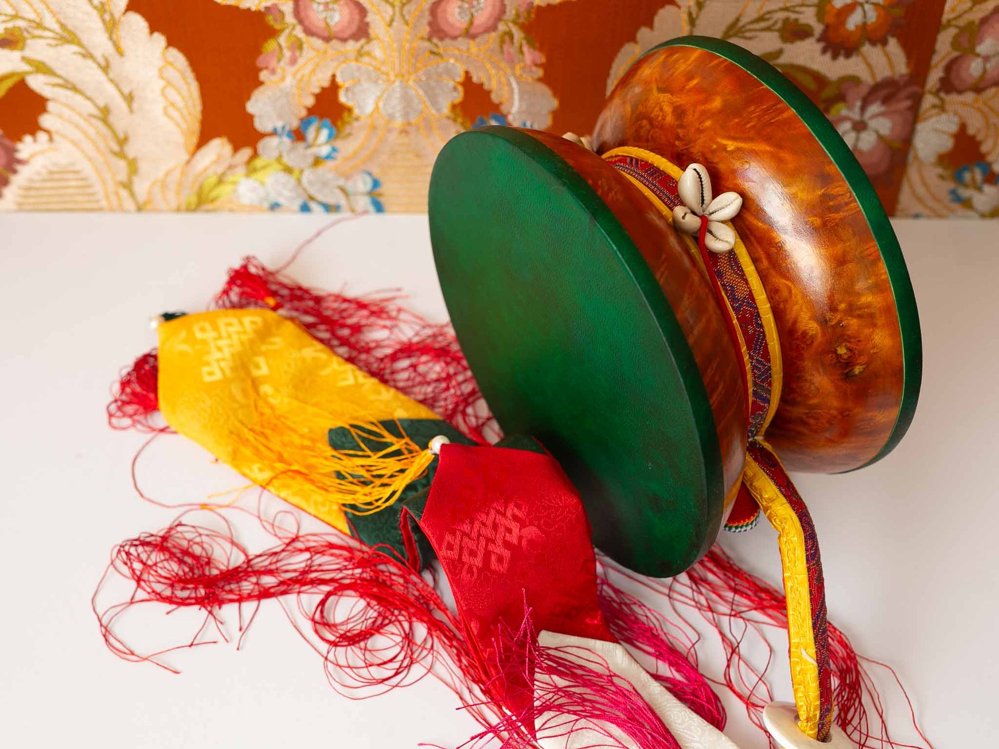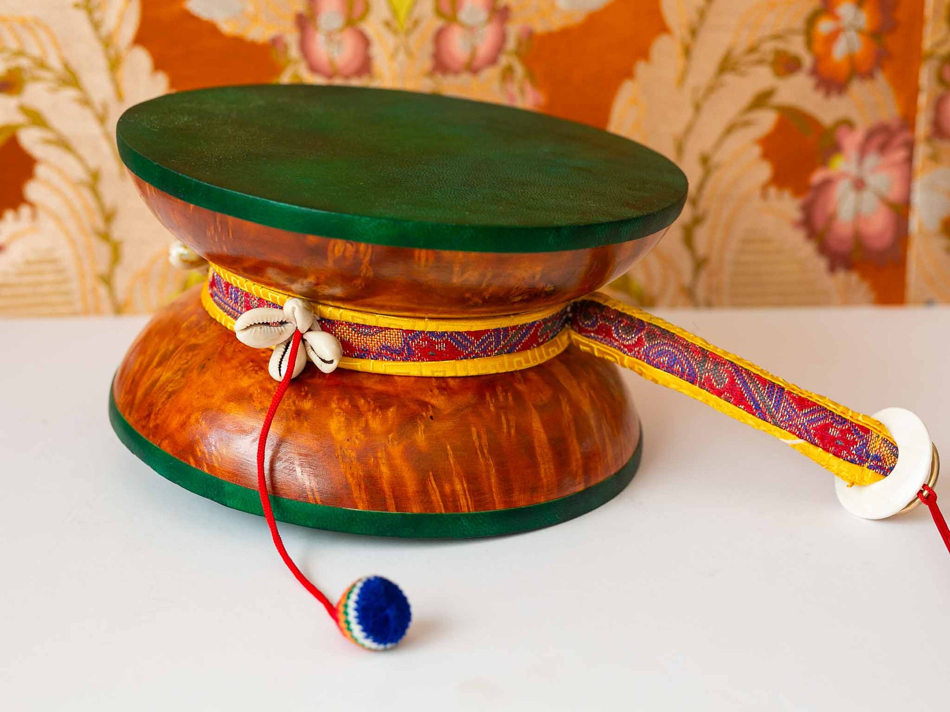 The Damaru is often used in Buddhist rituals as a sound offering. Its hourglass shape and resonating drumheads, signifies the union of wisdom and compassion - the very essence of Buddhist enlightenment. During Chöd rituals, the rhythmic beat of the Damaru helps practitioners transcend the ego, and summon benevolent spirits as they offer their own bodies as a symbolic feast. Chod drums are usually played by practitioners/students that have taken an initiation into this practice. Others might keep them in their shrine as a sacred object/offering.