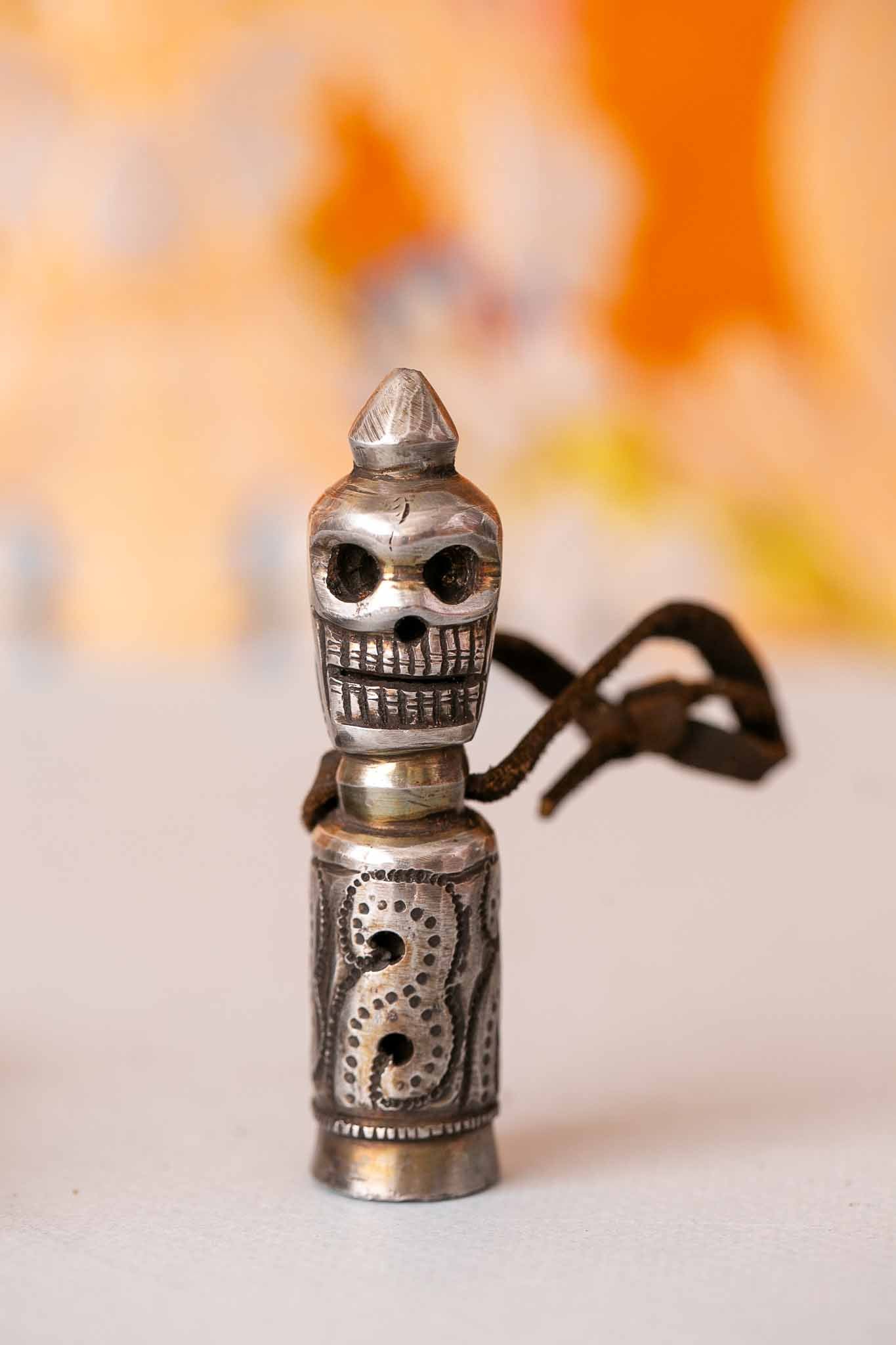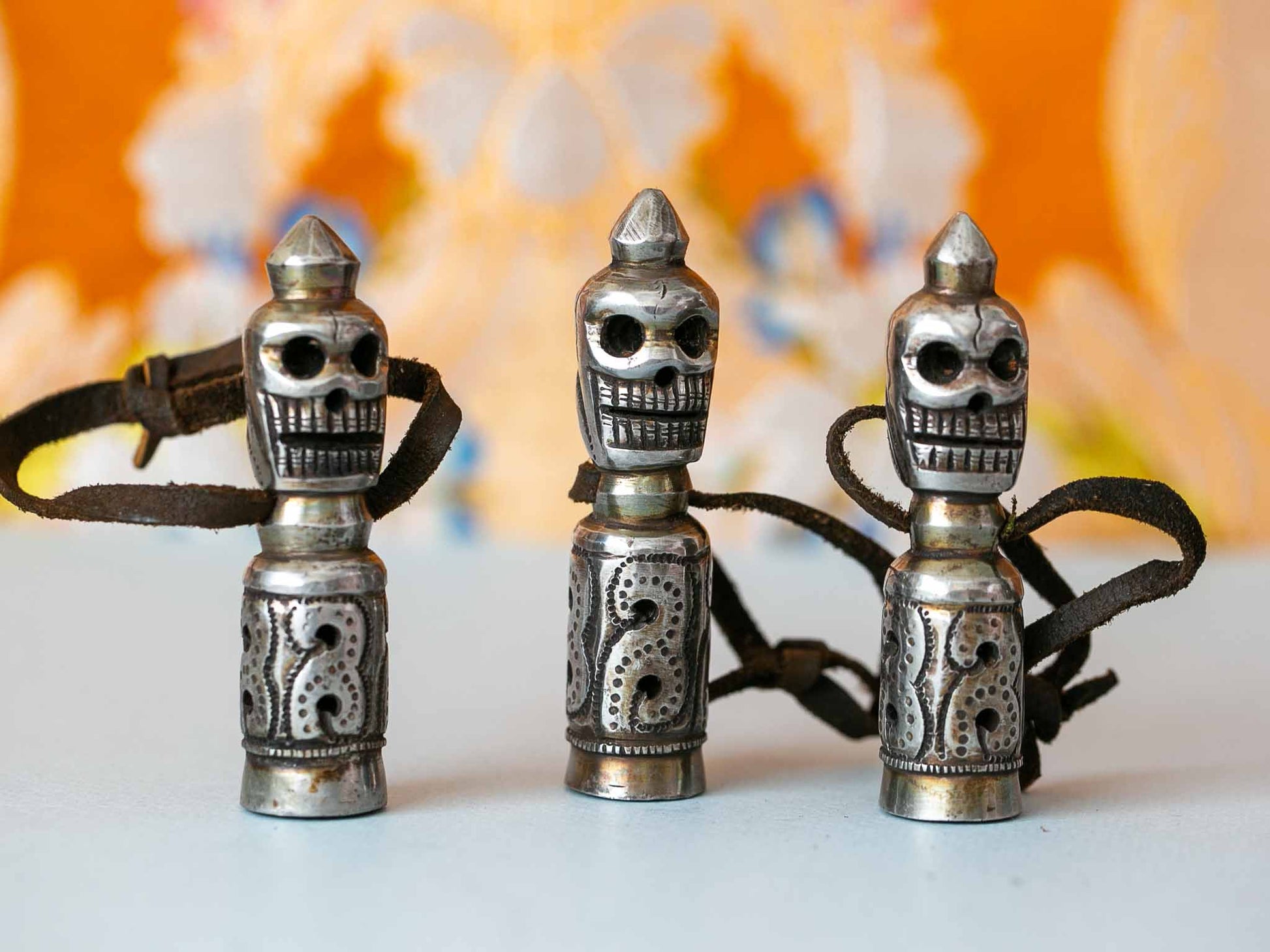 This seal has been made from iron. The top of the seal is in the shape of a Skull whilst the bottom stamp features the sacred tibetan symbols of Double dorje, Kartika and a pair of fish.
