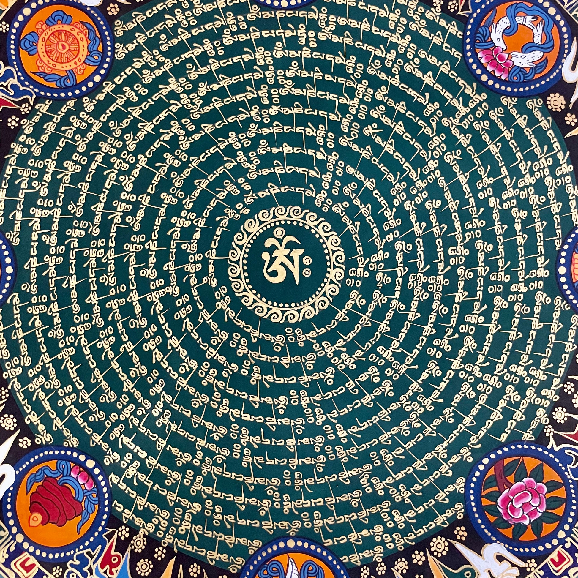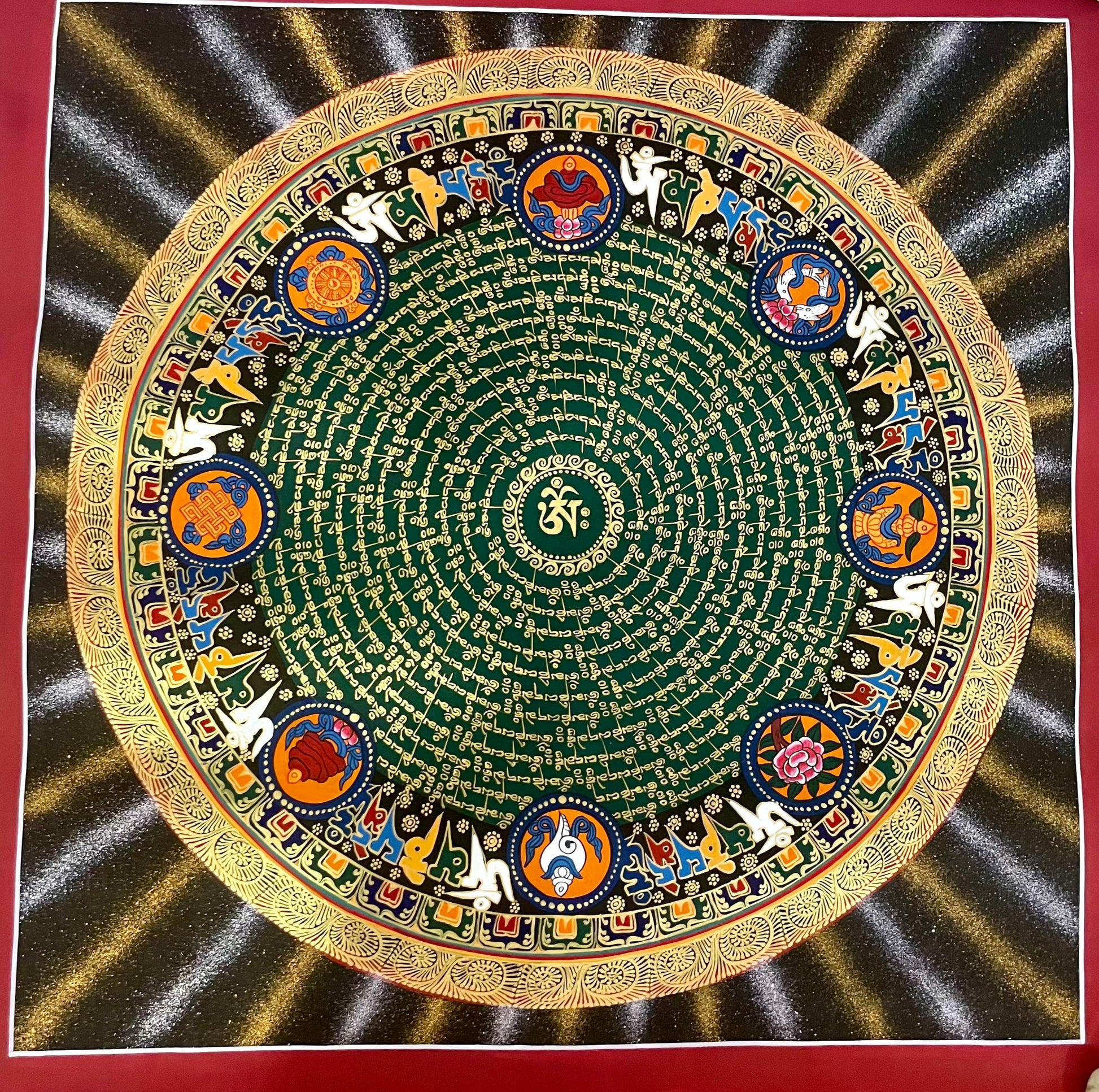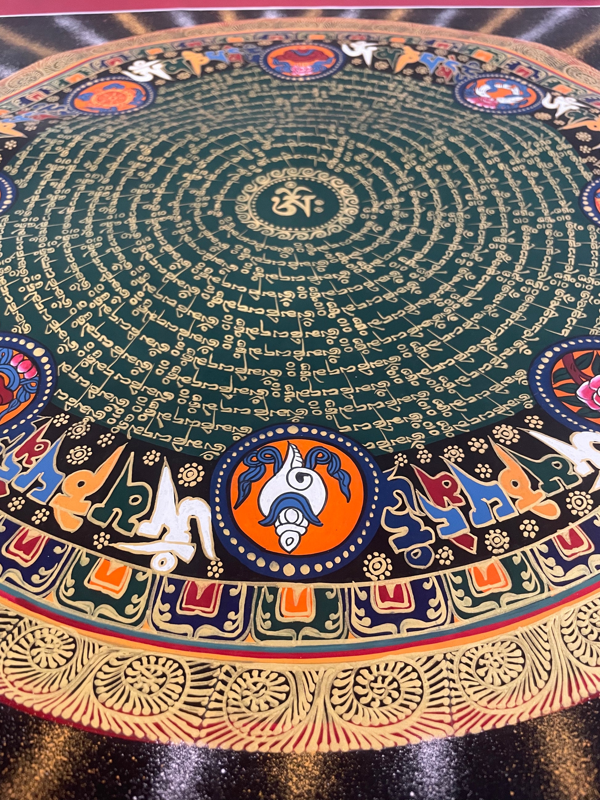 This beautiful original painting is of fine art quality and has been created by master painters from Nepal. This painting features the sacred syllable 'Om' in the centre, surrounded by the 8 Auspicious Symbols in a lotus pattern. The compassion mantra, Om Mani Padme hung extends radially outwards and is surrounded by lotus petals and an abstract golden pattern. All text is in the Tibetan script.