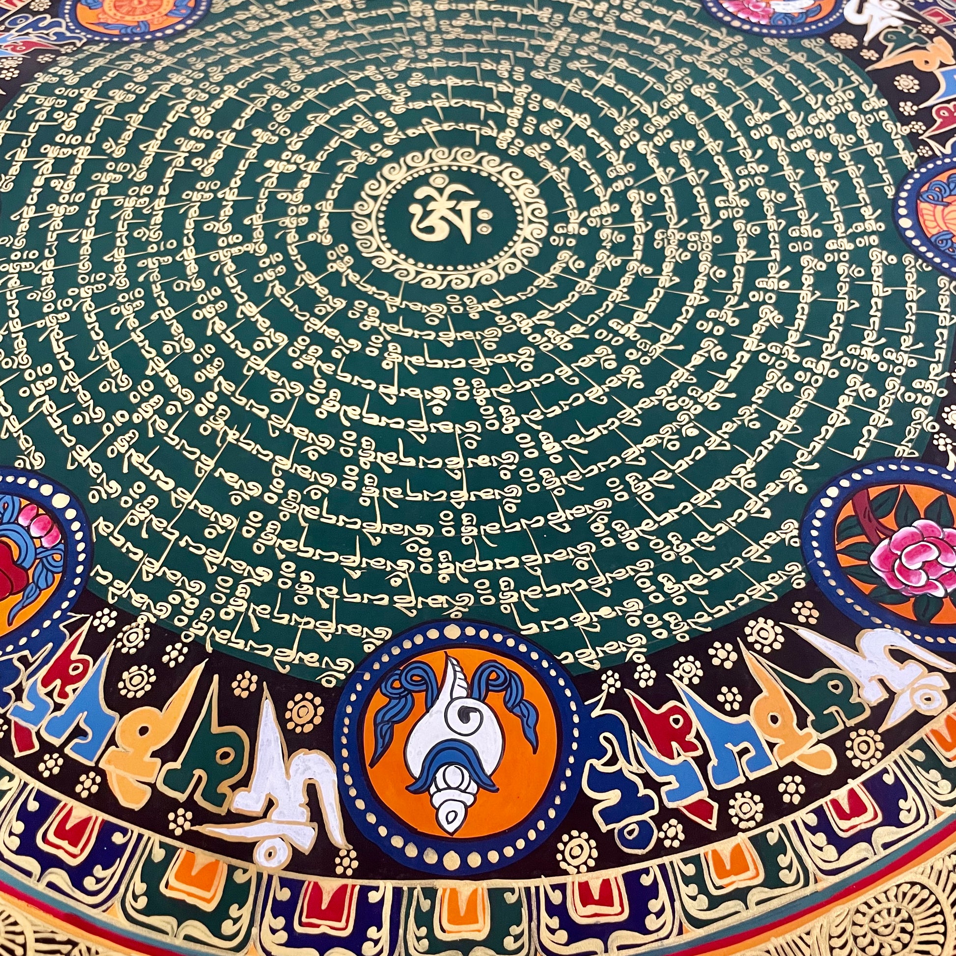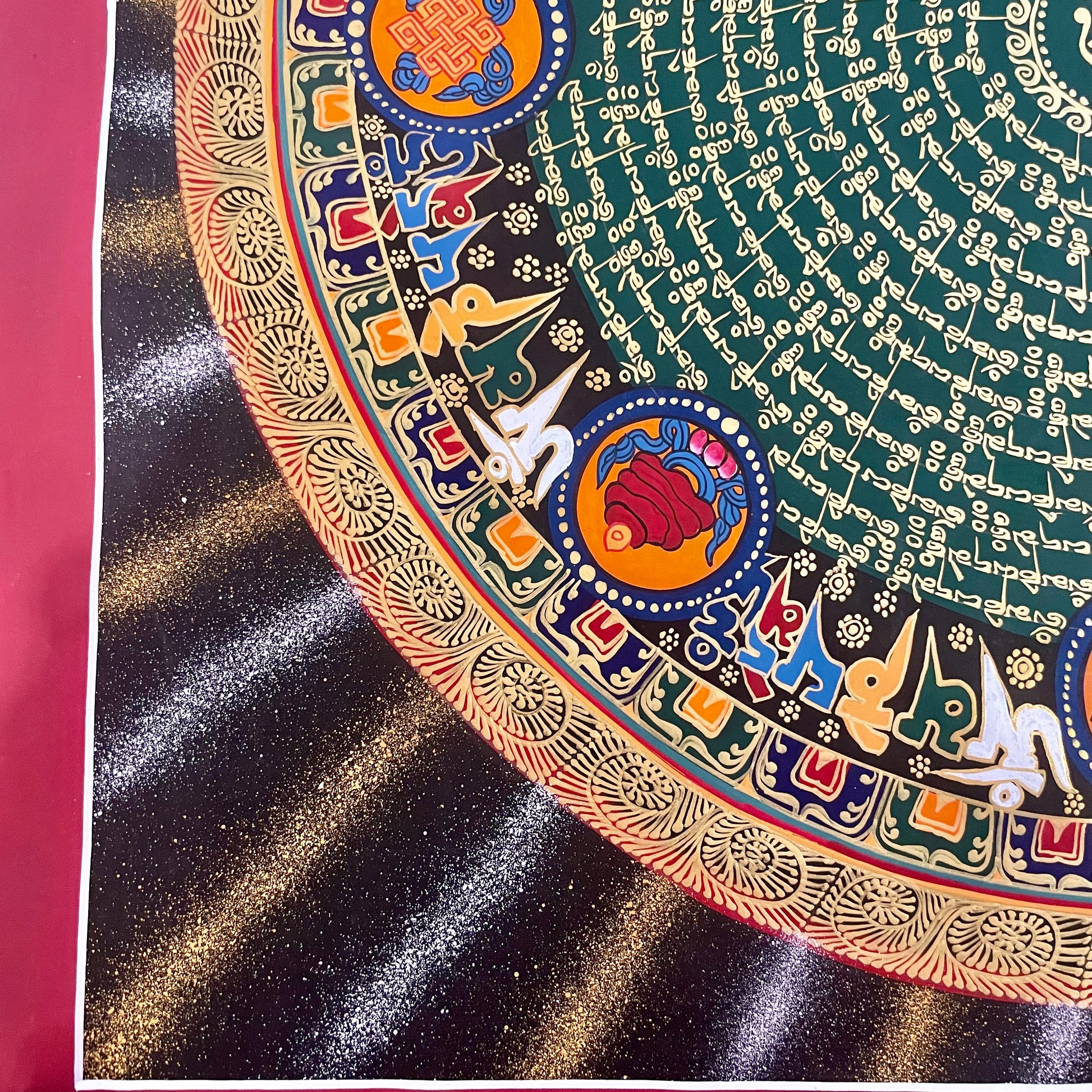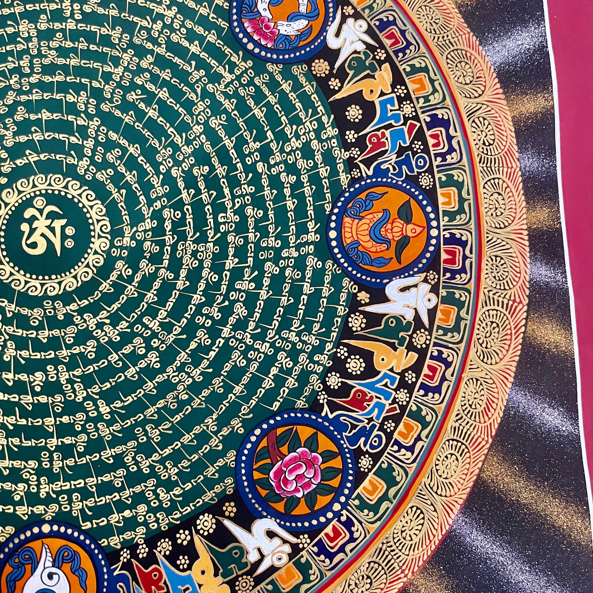 This beautiful original painting is of fine art quality and has been created by master painters from Nepal. This painting features the sacred syllable 'Om' in the centre, surrounded by the 8 Auspicious Symbols in a lotus pattern. The compassion mantra, Om Mani Padme hung extends radially outwards and is surrounded by lotus petals and an abstract golden pattern. All text is in the Tibetan script.