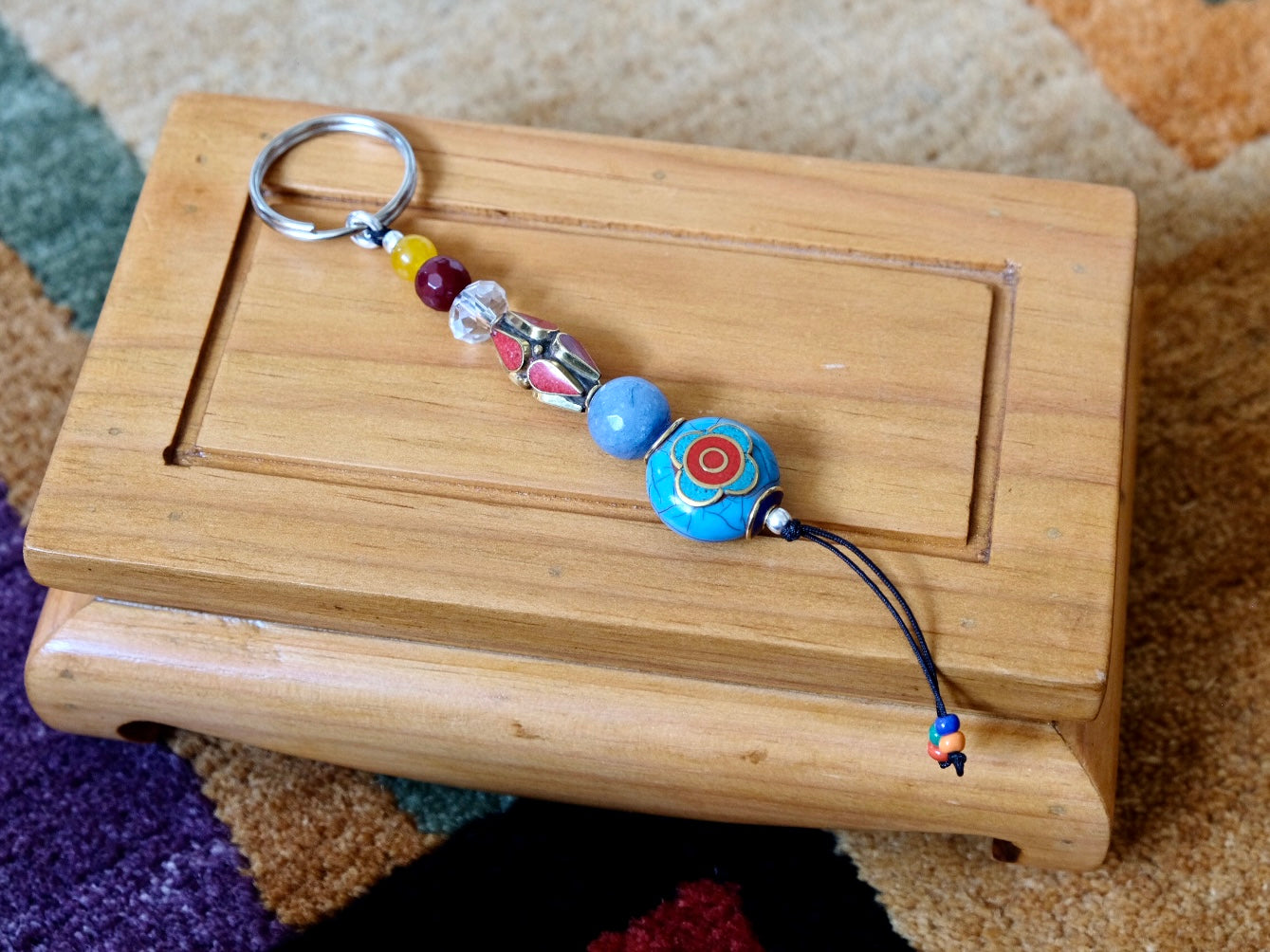 This keyring is made from high quality beads and inspired from the most common gemstones used in traditional Tibetan jewellery. We have sourced these from a Tibetan family who specialise in bead craft and carefully assemble them, one piece at a time.